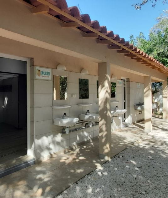 - Un blocco di servizi igienici rinnovato con WC, docce calde, bidoni per il bucato (di cui 1 per disabili), bidoni per la biancheria e servizi igienici per disabili (doccia, WC e lavandino).
